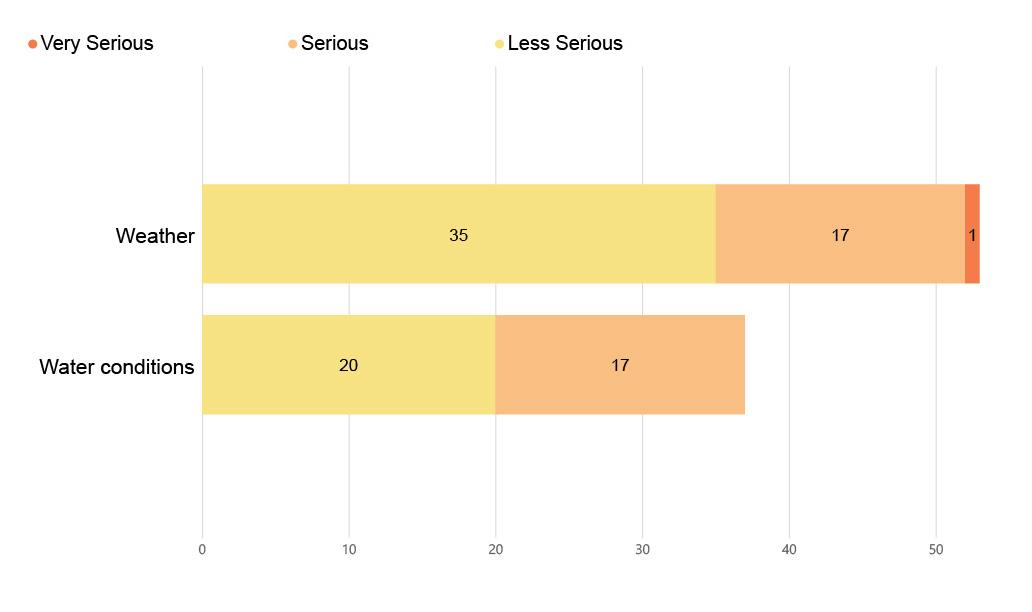 In 2020, there were 105 reports in which weather and/or water conditions had a direct impact on the vessel and/or personal safety. This is 13.9% of reported incidents. 43.8% of these were classified as very serious and serious.