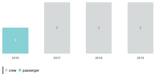 AMSA collects and records data on operational related fatalities5 on regulated Australian and foreign flagged vessels. Between 2016 and 2019, there were seven fatalities associated with seven incidents (Figure 19). All occurred on foreign-flagged vessels. Six involved crew members and one (in 2016) was a passenger fatality.