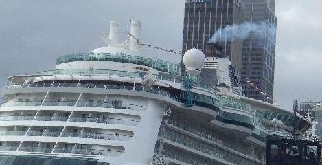 The Directions aim to reduce exhaust emissions of sulphur oxides and other particulate matter from cruise ships berthed in Sydney Harbour. Visible discharge from a ship’s exhaust stack/s is still possible even when low sulphur fuel or an exhaust gas cleaning system, or scrubber, is being used. In particular, the water used in scrubber systems to remove the bulk of the sulphur and particulate matter produces steam, which is visible from the exhaust stack—as shown by the following photo.