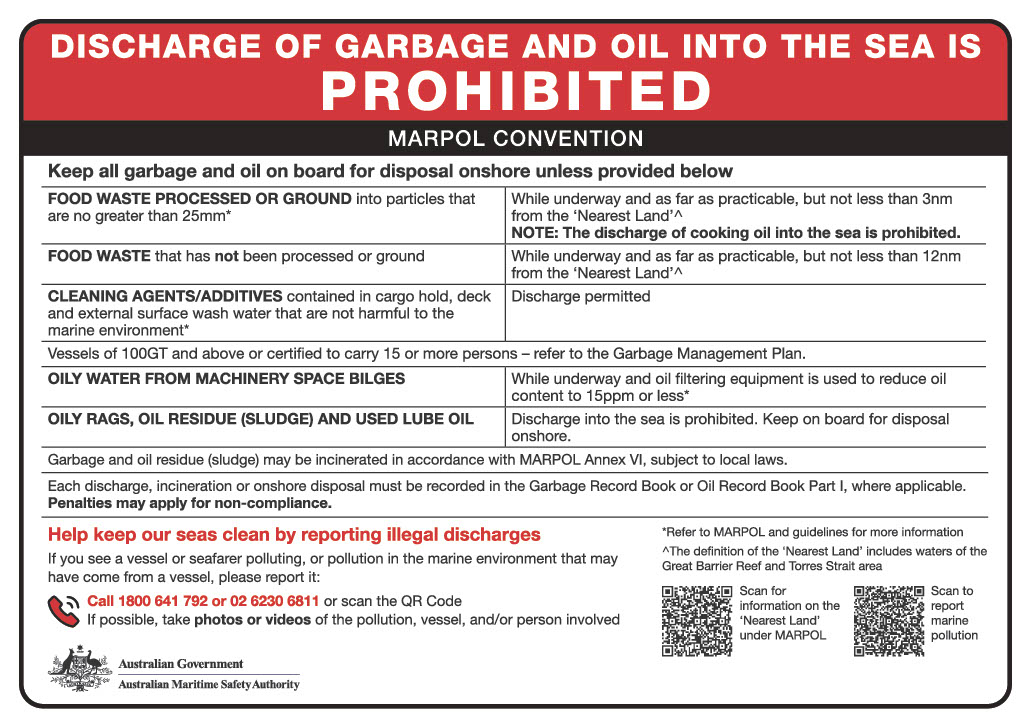 If your vessel is 12 metres or more in length, you must display a MARPOL placard.